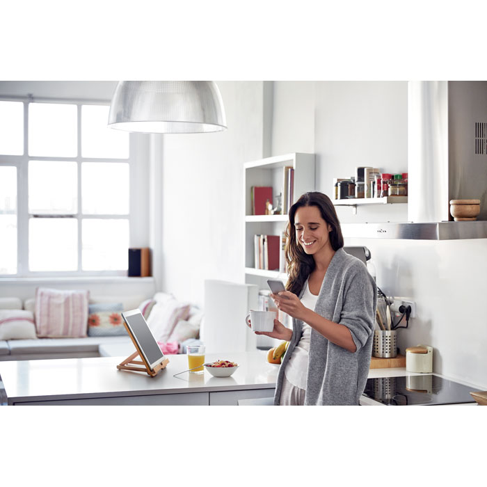 Foldable tablet or smartphone stand in bamboo. Bamboo is a natural product, there may be slight variations in colour and size per item, which can affect the final decoration outcome.
